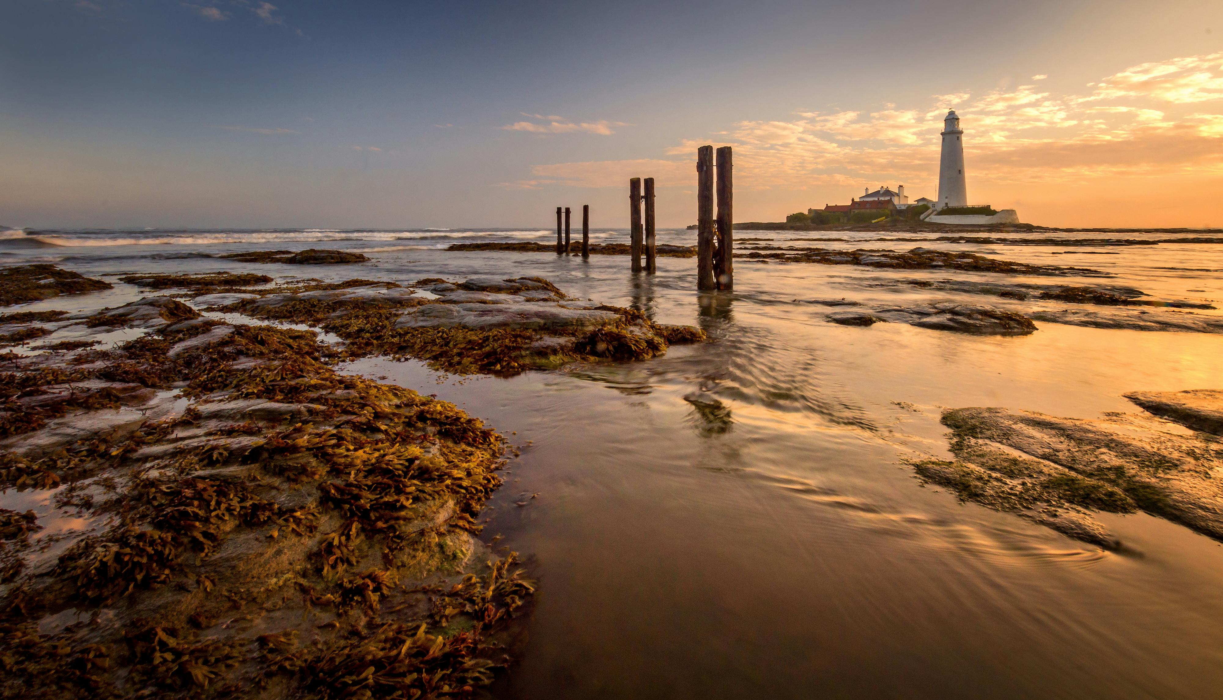 Capture of St Mary s Lighthouse at sunset with reflective shoreline at Whitley Bay, UK.