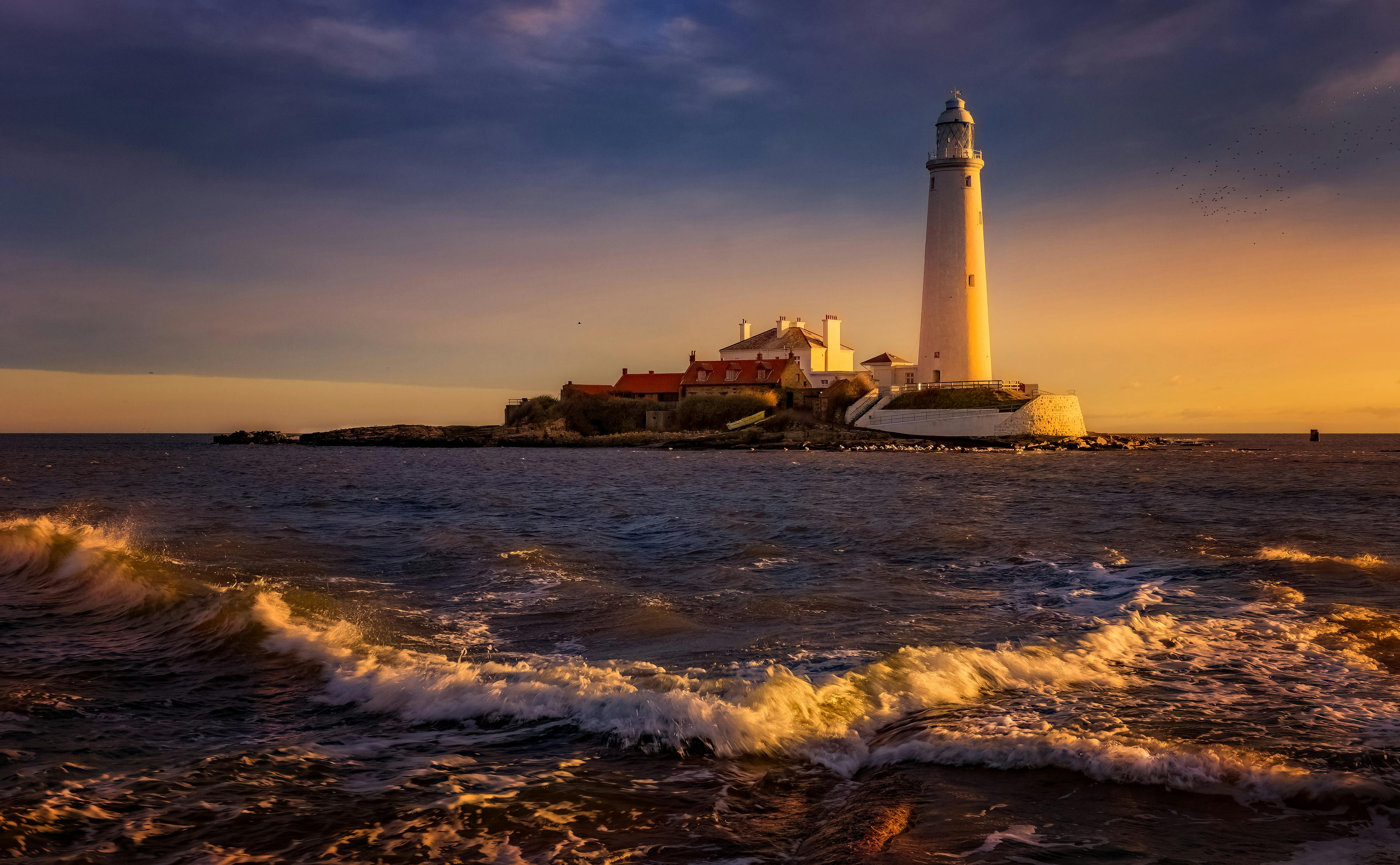 A mesmerizing view of St Mary s Lighthouse at sunset with waves crashing on the shore, located on the coast of England.