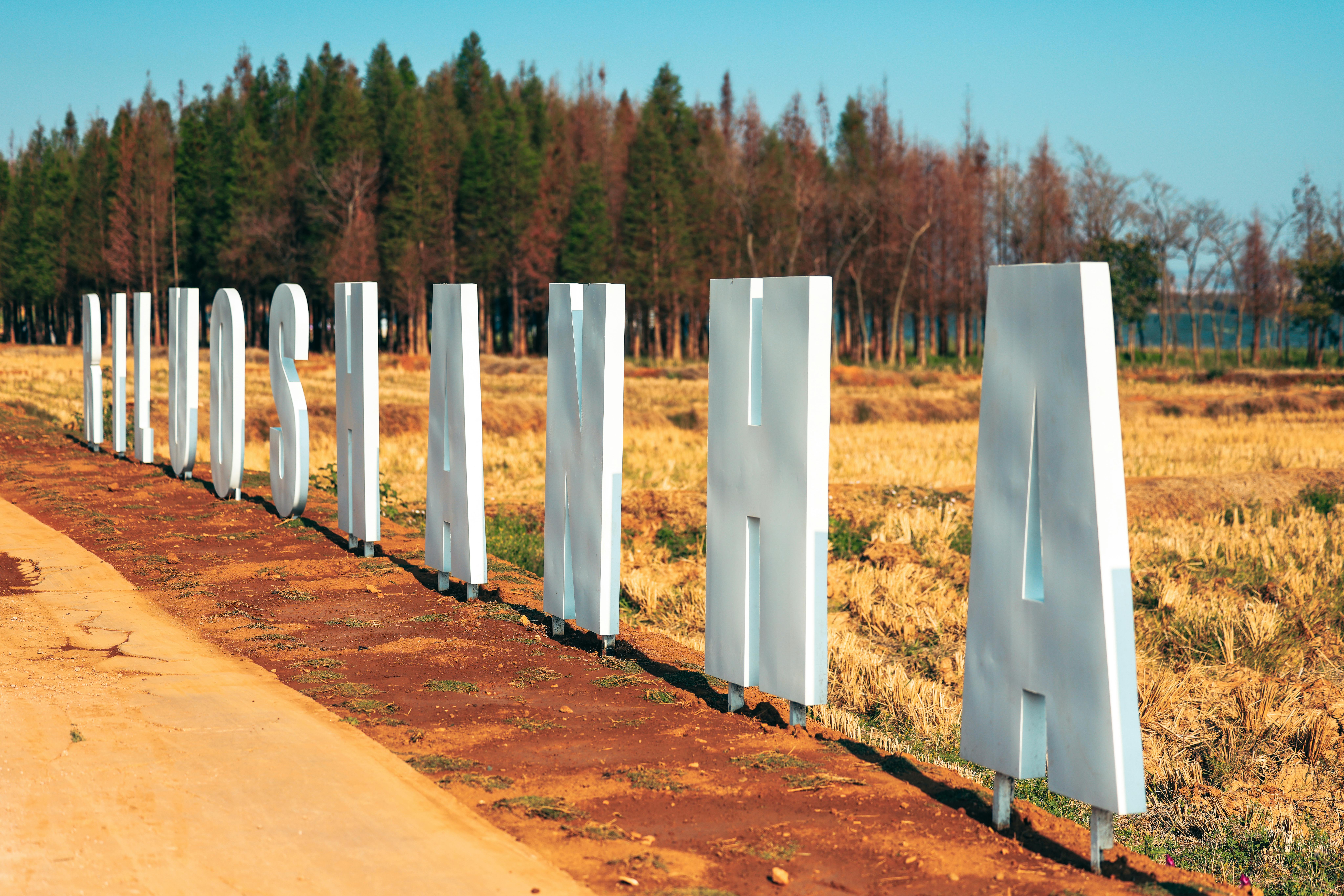 3D letters spelling  LUOSHAN  in a field with pine trees, clear skies, and sunlight.